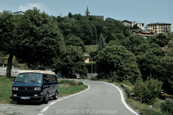 Höhendorf im Piemont, nördlich von Turin. Eng und gewunden sind die Steilstraßen.