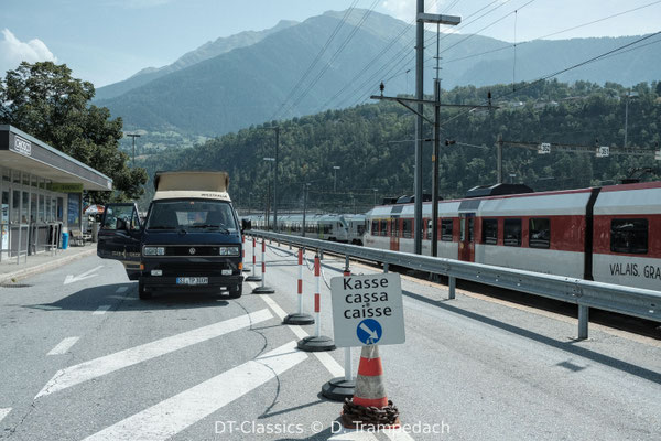 Und ja, es geht aus dem Titel schon hervor: Unser Lieblingsland, die Schweiz, wird in diesem Jahr tatsächlich nicht zum Zielgebiet. Einzig als Transfer-Region, durchqueren wir die Schweiz an einem Tag, und das mittels „Auto-Verlad“. Im VW Bus sitzend, rauschen wir am Zug durch den Lötschberg-Tunnel (Kandersteg-Goppenstein), und wenig später unterm Simplon hindurch von Brig (Wallis) nach Iselle in Italien.